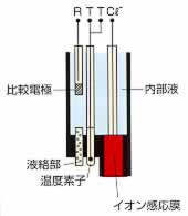 | ■mVモード mVモードで電極の起動力測定・良否判定が可能 ■イオン電極の取り扱いについて 塩素イオン電極やフッ素イオン電極を使用して試料水の濃度を測定する場合、イオン強度調整剤を校正時と測定時に 加えて試料水のイオン活量強度やpHの影響を受けないようにして、測定する必要があります。 ![]() ●塩素イオン電極で残留塩素が測定できるか? 塩素イオンは、水に溶けている塩素分です。 すなわち、水中に溶解している塩化物中の塩素分のことです。 例えば食塩は塩化ナトリウムNaClですが、これが水に溶解すると、Na+とCl-に分かれます。 Cl-は水中では塩素イオンになります。 塩素イオンは塩分濃度の指標として食品、化学、養殖、浄化槽、河川等あらゆる分野で測定される重要な水質項目 です。 残留塩素は、水中に残留する全ての有効塩素(消毒効果(酸化力)のある塩素)で、遊離残留塩素や、結合残留塩 素と呼ばれるものです。 上述したとおり、塩素イオンと残留塩素は別のものです。 従って、塩素イオン濃度が高いからといっても殺菌用の塩素が十分である訳ではありません。 また、塩素イオン計で残留塩素の測定はできません。 ●浄化槽放流水の塩素イオン測定の必要性 浄化槽に流入する生し尿の塩素イオンは約5500mg/Lとされています。 塩素イオンは生物処理では分解しないので放流水の塩素イオン濃度を測定すると何倍の水道水で希釈されたかの 判定ができます。 例えば、浄化槽放流水の塩素イオン濃度が110mg/L、水道水の塩素イオンが20mg/Lとすると、5500÷(110−20) =61.11よって、約61倍の水で希釈されていることになります。 これは浄化槽管理の重要な水質測定項目になっています。 ■仕様