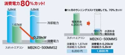 ■エアコンとの比較 小さな電力で大きくクールダウン。 同レベルの冷却能力をもつスポットエアコンに比べ、およそ80%消費電力を削減が可能です。 コンプレッサー不要で、排熱が発生しません。 ●1ヶ月のランニングコストで比較しても、70%カット!