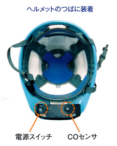 ヘルメットのつばに装着・世界初!! | LED点滅ヘルメット装着COモニター 品番 MB34PA-9111K 価格 ¥70,000.- |