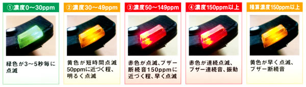 | ■特長 ●緑色LEDが視野内で点滅し、安全を知らせます。 ●警報は赤色LED、ブザー、振動で知らせます。 ●使用時間は3,000時間(無警報時)とエコタイプです。 ●充電プラグ差込口はmicro USB(USB Micro-B)端子に準拠しています。 ![]() ■動作状態 ![]() ■各部の名称 ![]() ■仕様