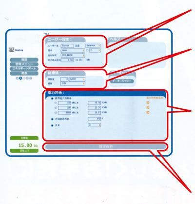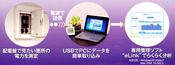 ●電気料金表示 現在値/過去24ヶ月の平均/過去24ヶ月分の指定月 ※電気料金は従量電灯メニューで計算されます。 ■PCでのデータの確認 PC無線電力計(MB8C-10RFS)に記録されたデータは、USB接続をすることでPC上で簡単にデータの確認が行えます。 ①カスタムのホームページ(http://www.kk-custom.co.jp)からパソコン用管理ソフト“eLink”をダウンロード! ②PC無線電力計(MB8C-10RFS)を付属のUSBケーブルでPCと接続! ③“eLink”を起動し、メニューバーに従ってデータを取り込み! ※詳細はホームページ上の“パソコン用管理ソフト eLinkマニュアル”をご覧ください。 ![]() ■eLinkでさらに便利 予め下記の設定画面に基本データを入力しておく。