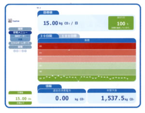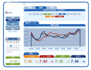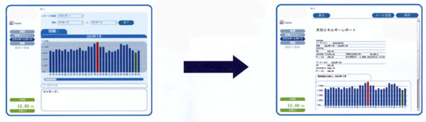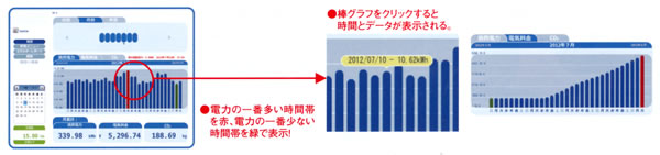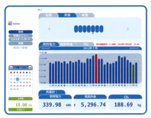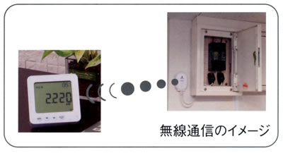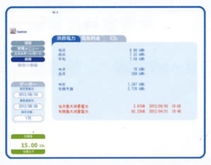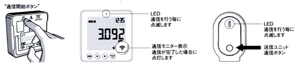 ●通信の準備 PC無線電力計と送信ユニット間の通信 ①PC無線電力計(MB8C-10RFS)、送信ユニット(MB8C-RFTS)、それぞれに電池を装填。 ②MB8C-10RFSの裏側にある“通信開始”ボタンを押し、表示部に“通信モニター表示”が点滅していることを確認。 ③その点滅の際に、送信ユニットの“通信ボタン”を押し、“通信モニター表示”が点滅から店頭にかわったことを確認する。 ![]() ■通信について 一度通信を開始すると一定間隔でデータを無線エネルギーモニターへ送信します。 ・送信間隔は10秒、15秒、20秒の設定が可能です。 ・初期設定は10秒となっています。 ![]() ■無線エネルギーモニターでのデータ確認 過去700日分のデータを保存!(1日に1時間毎の積算データが24個) ●現在値表示 現在の消費電力/現在までの電気料金/当日のCO2排出量 ※電気料金は従量電灯メニューで計算されます。 ●消費電力表示