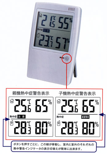 この熱中症指数を求めるには、黒球温度計を用いるのが一般出来ですが、本気では内蔵の温湿度を表にあてはめ熱中症指数を表示しています。
