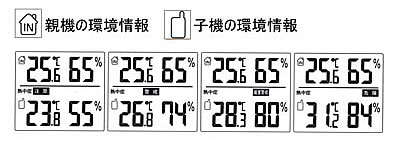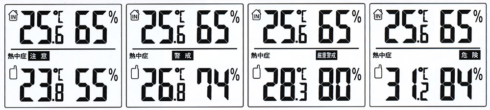 ●親機、子機それぞれの温湿度の測定状況によって、熱中症警告表示が下記の4種類いずれかが表示されます。