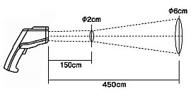 | ■特長 ●距離:測定径=450cm:φ6cm ●-60~+1600℃が測定可能。 ●手にフィットして使いやすいガンタイプデザイン。 ●Kタイプ熱電対温度計による温度測定(-64~+1400℃)も可能なハイブリッドタイプ。 ●温度表示:0.1℃単位 ●約1秒で表面温度の測定が可能。 ●測定値を固定表示するHOLD機能付き。 ●放射率:0.10~1.00の範囲で0.01ずつ可変 ●MAX(最大値)/MIN(最小値)メモリ機能付き。 ●AVERAGE(平均値)表示付き。 ●HI(上限)/LO(下限)アラーム機能付き。 ●バックライト機能付き。 ●オートパワーオフ機能付き。(最終ボタン動作から1分間動作がない場合には自動的に電源が切れます。熱電対測定時には12分) ●LOCK(連続測定)機能付き。 ●PSCマーク認定品 ■製品概要 ●使用イメージ ![]() ■仕様