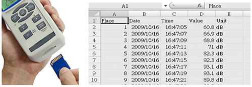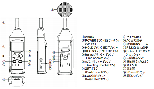 ![]() IEC61672 class2に準拠設計の騒音計です。 ■特長 ●IEC61672 class2に準拠設計の騒音計。 ●記録データは市販の表計算ソフトウェアで利用できるので、様々な用途に活用できます。 ●データ記録は、自動記録/手動記録から選択可能。自動データロガーのサンプリング設定時間は1、2、5、10、30、60、120、300、600、1800、3600秒より任意に設定可能。 ●暗所でも見やすいグリーンバックライト機能付きです。 ●測定値を一時的に表示固定するホールド機能付き。 ●測定値のMAX(最大値)/MIN(最小値)表示機能付き。 ●電池の消耗を防ぐため一定時間本器を操作しないと自動的に電源が切れるオートパワーオフ機能を搭載しています。 ■SDカードを装着して測定結果を記録することが可能です。 SDカードの記録データは、CSVファイルとしてExcelに取り込みができます。 ![]() ※SDカードは製品に含まれていません。別途お買い求め下さい。 ※市販のSDカード(1~16GB)に対応していますが、全メーカーのSDカード製品に対する動作認証は行っておりません。SDカードによってはご使用になれない場合がございますので、予めご了承願います。 ※SDXCカードやMMCなどほかの種類のメモリーカードはご使用になれません。(SDXC、SDHCはSDアソシエーションの登録商標です。) ■各部名称 ![]() ■仕様