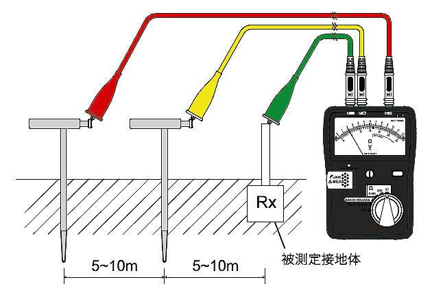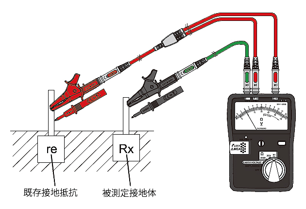 接地抵抗と接地電圧の測定に対応。![]() ■特長 ●精密測定の「三線式」と簡易測定の「二線式」の両対応。 ●接地電圧測定機能は、最高電圧AC30Vまで測定可能。 ●正しい接地状況を確認できるLED付き。 ●暗所でも測定ができるバックライト付き。 ●配電線、屋内配線、電気機械設備、接地銅棒施工現場に。 ■精密測定 被測定接地体(RX)から5〜10mの間隔で一直線にT型補助接地棒を地面に打ち込み、赤色プローブと黄色プローブをT型補助接地棒に、緑色プローブを被測定接地体(RX)にそれぞれ接続して測定します。 ![]() ※測定対象やその周辺で感電が想定される箇所では、絶縁保護具を着用してください。 ■簡易測定 赤色プローブを既存接地極(re)に、緑色プローブを被測定接地体(RX)に接続して測定します。 ![]() ※測定対象やその周辺で感電が想定される箇所では、絶縁保護具を着用してください。 ■各部名称 ![]()