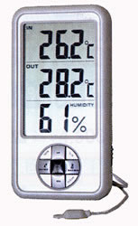 ●卓上型デジタル温湿度計。 ●時計、温度、湿度のトリプル表示。 ●温度は内蔵センサー(IN)と外部センサー(OUT)のそれぞれの温度を切り替えて表示できます。 ●MAX(最大値)/MIN(最小値)メモリ機能付き。 ●スタンド機能、壁掛け用フック穴付き。 |