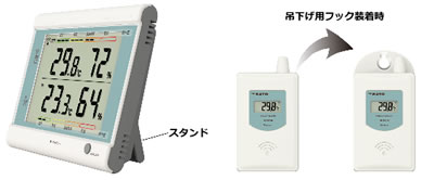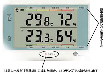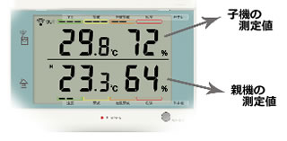 | ■特長 ●約90mまでの無線機能※ 約90mまで子機の温湿度測定値を無線で親機に送信します。親機にて設置場所の温湿度、子機で離れた場所の温湿度測定が可能です。 ※家屋内等の遮蔽物がある場合は無線到達距離が短くなります。 ![]() ●簡単操作 子機との無線通信を同期するリンクボタンを親機に搭載。 面倒な配線は不要で、簡単に無線通信を行います。 ●最高値、最低値を表示 親機、子機それぞれの最高値と最低値を記録しますのでmMAX/MINボタンでいつでも確認できます。 ●熱中症注意レベル 親機、子機それぞれの熱中症注意レベルを測定します。 注意レベルが「危険域」に達した場合、LEDランプでお知らせしますので、熱中症予防の目安としてご使用いただけます。 ●取付、設置方法 親機は壁掛け、立て掛けのどちらでもご使用になれます。子機は取り外し可能な吊り下げ用フック付。 ![]() ■防水規格と設置場所について 親機は防水ではありません。室内でご使用下さい。 子機の防水規格はJIS C 0920 IPX3準拠です。(防雨型:鉛直から60度の範囲で落ちてくる水滴による有害な影響がない) 最適な測定のために、以下の場所へ設置することをおすすめします。 ●雨や雪が直接当たらない場所。 ●地上約1.5m程度で、直射日光が当たらない場所。 ■熱中症注意レベル表示シール使用例 ![]() ■仕様