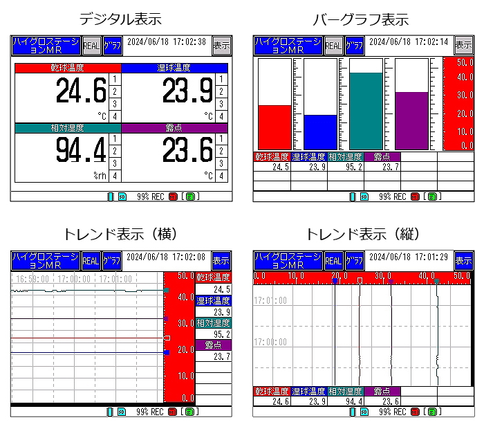 | アスマン式通風乾湿計の原理に基づいたセンサ部とぺーパーレスレコーダーがセットになりました。 一般の電子式湿度センサとは異なり経年変化が極めて小さいため、長期間安定して信頼性の高い湿度測定が可能です。 測定値は指示計部のSDカードへ保存が可能で、表計算ソフトなどを利用することでデータの解析が可能になります。 ![]() ■特長 ●センサ部は電子式湿度センサと比べ経年変化が小さいPt100Ωを採用していますので、長期間安定した測定がおこなえます。 ●乾球温度・湿球温度・相対湿度・露点の4要素を同時表示します。 ●表示はデジタル、トレンドなど多彩な表示が可能です。 ●記録データはSDカードに保存、表計算ソフトなどでもデータ処理・グラフ化などが可能です。 ●MC15K-5RAD-MR-KENTEIのセンサは、(財)気象業務支援センター検定付です。 ■多彩な機能 用途に合わせて表示機能の選択が可能です。 ![]() ■共通仕様