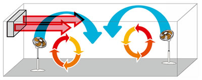 | ■工場扇&サーキュレーター 首の角度が最大65°上を向きますので冷暖房の空気を上向風により、 天井から壁伝いに室内の隅々まで行渡らせることで室内の温度差を少なくすることができます。 ![]() ■特長 ●最大65度上に向きます。上向きの首の角度は-5度・0度・20度・35度・48度・65度の6段階で調整可能。 ![]() ●上を向けたまま左右75度首を振りますのでサーキュレーター機能も兼ね備えています。 ![]() ●3脚扇に比べて省スペースで設置が可能。(330mmの省スペース化) また、ワイドベースなので安定感抜群!最大240mmの無段階高さ調整機能付。 ![]() ■仕様