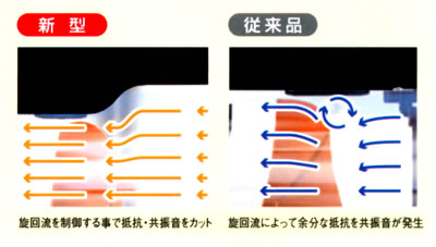 VF DESIGNにより余分な 旋回流(風の渦)をなくし、スムーズな風の流れを生みました。(図参照)