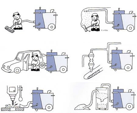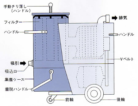 | ■特長 ●3相誘電モーターとターボブロア採用により、長時間連続作業ができます。 ●3相誘電モータとターボブロア採用により、安定した吸引力を発揮します。 ●フィルター面繊機を多くとり、目詰まりによる吸引力の低下を防ぎます。 ●小回りのきく自在車輪と大型後輪で、移動運搬はスムーズです。 ●ハンドル操作による容器着脱のため、手を汚さずに回収物のは器ができます。 ●堅牢な外見は自慢です。 ●排気エアーは集中排気のため、ブロー(吹き飛ばし)に使う事もできます。 ●セントラルバキュームシステムのバキューム源としても使用できます。 ●工場設備ラインのバキューム源としても威力を発揮します。 ●クリーンルーム用HEPAフィルターの取付(オプション)も可能です。 ■各部名称 ![]() ■用途 倉庫、百貨店、銀行、ホテル、劇場、放送局、病院、バス、船舶、食堂、コンピューター室、通信木質、遊技場、研究室、工場(セメント、紡績、化学肥料、製粉、硝子、製薬、食品)etc ![]() ■仕様