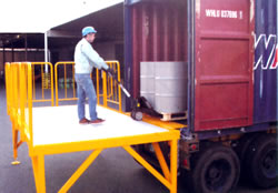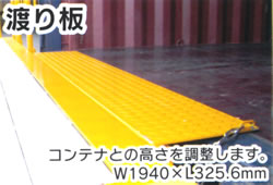 | ■特長 ●高い安全策とハシゴ付のため安全に作業できます。 ![]() ●コンテナへのセットはフォークリフトでできます。 ●接続部の高さは調節可能で様々なコンテナにセットできます。 荷台を接続後、ジャッキで高さを調節できます。●コンテナのある場所へフォークリフトで移動する事によりすぐにバンニングできます。 ●転落防止ストッパーで荷物の転落防止に(標準装備) ![]() ●その他特長 ![]() ■使用方法 ![]()