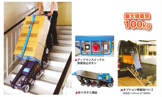 | ■タイプ・特長 ◆MC4U-100R-2S ![]() ![]() ●平地⇔階段をスムーズな連続作業 ○階段上 ・昇降スイッチはデッドマン式を採用 スイッチから指を離すと電磁ブレーキの働きで階段途中でも確実に停止し、すべり降りる心配はありません。 ・ボタン操作一つで、大きな力を使わずに階段昇降できます。 ・走行ベルト(ゴムクローラー)がしっかりと階段をグリップします。 ○平坦地 ・駐車ブレーキをかけると同時に転倒防止スタンドが働くため、安心して荷物の積み降ろしができます。 ・平地は動力を使わずに手押し台車の様に走行します。 ○特長 ・階段(電動)と平地走行(手動)をスムーズに連続作業ができます。 ・収納に便利なワンタッチで折りタタミができます。 ・長時間使用の場合は、スペアバッテリーパック(別売)との交換ができます。 ・バッテリーは制御弁式で液モレ、補水の心配がありません。 ◆MC4U-80S ![]() ![]() ○特長 ・その場で回転できるため狭い踊り場での荷物運搬に最適です。 ■仕様