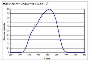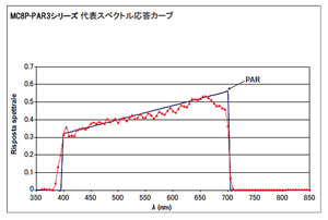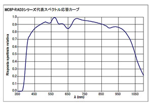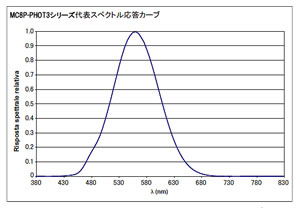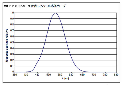 光度測定プローブのスペクトル応答カーブは、明所視標準比視感度として知られている人間の目の応答カーブに近似しています。スペクトル応答におけるMC8P-PHOT3Sシリーズと明所視標準比視感度の差は誤差F’1で計算されます。プローブの校正は一次度量衡標準機関の校正を受けた照度計との比較によって行われます。校正要領はCIE文書No.69(”Methods of characterizing illuminance meters and