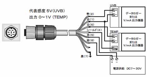 ■電気的な接続と測定値受信機器 UVB計の出力コネクタの接続ピンは以下の通りです。 1:UV、V出力(+)、温度 V出力(+)に対するGND(-) 2:UVBバンドの放射照度測定に対する出力信号、代表感度5V/(W/m 3:使用していません 4:シールド 5:供給電源GND(-) 6:温度測定に対する出力信号、-40〜+60℃=DC0〜1V 7:筐体アース 8:供給電源(+)DC7〜30V 耐UV出力コネクタ(UVB計側)付で供給されるケーブルは7芯+シールドで、以下の色コードです。 注:UVB計の負荷インピーダンスは10KΩ以上でなければなりません。接続図は以下の通りです。 ![]() MC8UVB-02Sは入力インピーダンスが10KΩ以上の電圧信号受信計器あるいはデータ受信機器に接続しなければなりません。 通常、UVB計の出力信号は、太陽にさらされた状態で、1Vを超えません。 UVB計の特長をより良く機能させるため、0.1mVの分解能を持つ受信側機器を使用して下さい。 ■校正および測定 放射計の感度S(または校正ファクター)により、放射照度を、内部の増幅回路が発生するmV信号で定義することができます。 出力信号にわずかなミリボルト(mV)のオフセット値が生じる可能性があります。 この場合は、夜間の測定データを得、このオフセット値を通常の測定値から差し引くことをお薦めします。 センサにおいて電位差(VoutUV+)が測定されると、以下の数式によりE 放射照度が得られます。 Ee= [VoutUV+]/S : W/m で表わされた放射照度を示します。 VoutUV+ : Vで表わされ、マルチメータで測定された電位差を示します。 Ee: V /(W/m )で表わされ、UVB放射照度計上のラベルに表示された校正ファクターを示します。(校正ファクターは校正レポート 中にも表示されます) オフセット値OFが存在する場合、上の計算式は以下のように変更する必要があります。 Ee = ( [VoutUV+] - OF) /S 同様に、VoutTemp+の電圧値が分かれば、以下の計算式でUVB計の内部温度を知ることができます。 T=100・[VoutTemp+]-40℃ VoutTemp+=0.532Vが検出された場合、上の計算式により内部温度13.2℃が与えられます。 T=100・0.532-40℃=132℃ UVB放射照度計は工場で校正され、それぞれの校正ファクター(感度)で供給されます。 校正は、並行かつ均質な光をディフューザ全面にあてたときの放射照度計からの出力信号を測定して行います。 使用される光源は、関連するスペクトル放射が既知である色を備えた高温白熱球で、白熱球は第一次度量衡機関の年次校正を受け ています。 MC8UVB-02Sの最良の性能を得るため、年に一度の校正チェックをを強くお薦めします。 現時点ではこの種の放射照度計の校正に関する国際的な合意が存在しません。 従って、校正に関わる係数は以下の文献において報告されている校正要領に依っています。 ![]() ![]() ![]() |