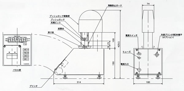 | ●ワンプッシュで迅速かつ正確にサンプルの破壊強度が測定できます。 ●新型のモーター採用により昇降速度のずれが大幅に改善されております。 ●最大40kg(392N)まで測定できるので非常に硬いサンプルも測定可能です。 ●演算付プリンタが内蔵されております。 ●ワンタッチ飛散防止カバーが付いています。 ●オプションの校正セットを使って、お客様で校正を行う事が可能です。 ![]() ■外観寸法 ![]() ■仕様