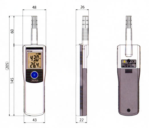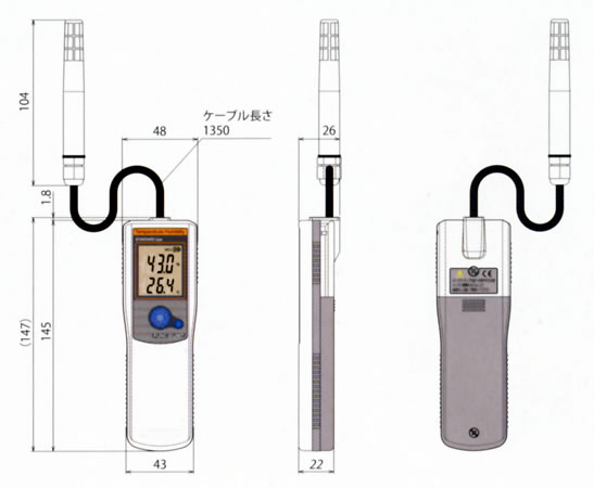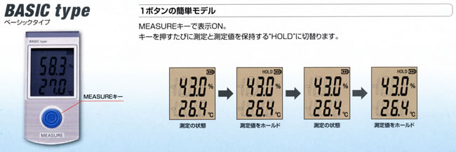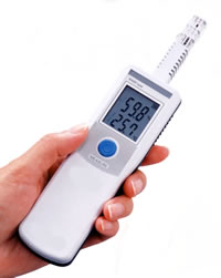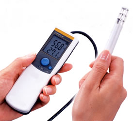 | ■小形軽量で握りやすく、押しやすいワンタッチ操作 エアコンの吹き出し口の測定など、機器を高く掲げて測るときも高精度携帯温湿度計なら大丈夫。 女性にも持ちやすい小形で、質量はわずか120g(一体形)。 ラバーグリップを使用しているので滑りません。 操作はボタンを押すだけのシンプル操作。 右手左手どちらでも押しやすいように中央にボタンを装備。 ■特長 ●断トツに速い応答時間 待ち時間を1/4以下に短縮 測定値が安定する(熱平衡状態)まで数分かかっていたものが30秒台に短縮。 作業効率が大幅に向上します。 ![]() ●少ないボタンで簡単操作 ![]() ![]() ●導入コスト・ランニングコストも満足の1台 センサは直接測定を行う空気に触れるため寿命があります。 高精度携帯温湿度計は低価格モデルでありながら、センサ交換方式を採用しているので、 お客様でも交換作業が可能です。 ![]() センサユニットはドライバー1本で簡単に交換、もちろん、調整などは不要で、交換後すぐにご使用になれます。 注意:プローブ形はお客様にてセンサ交換はできません。 ●トレーサビリティ証明書発行可能(別売) ■タイプ