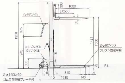 | ■特長 ●過負荷防止バルブ付き ●脚もフォークを延長し、脚巾が広いので大きな荷物を載せても安定します。 ■寸法図 ![]() ![]() ■タイプ