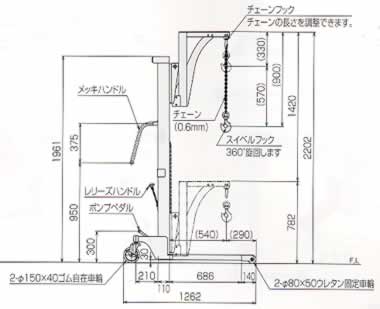 | ■特長 ●チェーンはフックにひっかけるだけで長さ調整ができます。 ●吊りフックはスイベルタイプですので、どの方向にも簡単に向きます。 ●過負荷防止バルブ付き ■フック上昇時 ![]() ■仕様 ![]() ![]() ![]() ■仕様 (mm)
