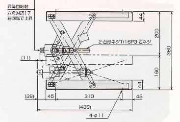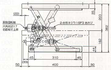 | ■特長 手動回転式 積載荷重:300kg ※昇降工具として、対辺17ラチェットレンチ・17スパナをご用意下さい。 ■下降時 ![]() ■寸法図