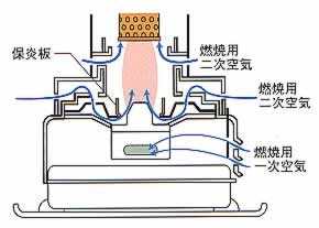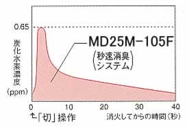 | ■メタルバーナ採用 消火時のニオイを抑え、耐久性も向上。さらに快適にお使い頂けます。 ![]() ■新・2段燃焼構造 保炎板と、2段で空気を取り入れる燃焼構造の採用で、効率良く安定した燃焼を実現します。 ![]() ■ニオイの少なさ 消火時に秒速消臭システムがはたらき、火力を落としてバーナを高温にし、ニオイの元となる未燃ガスを燃やします。 ![]() ■音を包み込むボックス構造 バーナ部をボックスで包み込みことで、最大燃焼時も45dBの運転音。 さらに、放電音のしないセラミック点火ヒータを採用しています。(MD25M-105Fの場合) ■安心・使い易い