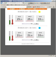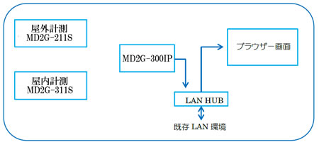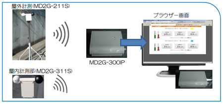 | 近年熱中症にての事故が多発してます。 本システムは熱中症予防の目安や労働環境の熱ストレスの評価として使用されている WBGT暑さ指数を計測する事ができる黒球温度、環境温度、湿度センサー部と計測データを受信し ネットワークに送信する送受信部から構成されネットワーク構築によりリアルタイムにブラウザー画面にて 監視でき事故を未然に防ぐ手助けに役立つシステムです。 尚、計測部と送受信部は無線方式の為面倒な配線は不要です。 又、暑さ指数は測定数値ごとに4段階の色にて表示され点滅にて画面上に危険度をお知らせします。 ![]() ■システム構成 ![]() ![]() ■主な使用場所 ●高温作業場、作業現場等 ●学校の体育や部活動 ●屋内、屋外のスポーツ ●道路、保線、農作業等 ●老人ホーム ●高齢者の室、乳幼児の室 ●保育園室内、幼稚園室内 ●病室、その他の医療機関 ■主な仕様 設置条件等 ●屋外計測部設置(MD2E-6111DG-G) *設置は専用スタンドを使用するか壁等に取り付け送受信部との交信範囲内に設置して下さい *防滴構造になっています。(専用スタンドはオプション品) *電源供給は乾電池単1x2本(電池残量警告は屋内送受信部で表示する)寿命約180日 *通信距離;直線無障害で約20m(電波環境にて影響されます。) *交信は窓ガラスを利用して下さい。(厚い壁、コンクリート壁、鉄板等は無理です) ▲注意;使用乾電池単1x2本は付属していません。 ●屋内計測部設置(MD2E-6111DG-S) *設置は卓上型です。机や棚等に置いて送受信部との交信範囲内に設置して下さい。 *電源供給は乾電池単1x2本(電池残量警告は屋内送受信部で表示する)寿命約180日 *通信距離;直線無障害で約20m(電波環境にて影響されます。) *交信は窓ガラスを利用して下さい。(厚い壁、コンクリート壁、鉄板等は無理です) ▲注意;使用乾電池単1x2本は付属していません。 ●屋内送受信部設置(MD2G-300IP) *壁掛け、棚置きタイプです。計測部との送受信範囲内に設置し、 LANケーブルにて既存のLANに本装置とパソコンに接続して下さい。 *制御部の電源供給はAC100V(ACアダプター使用)で行います。 *通信用LANは有線接続を基本としますが無線LANアダプタを介在させることでWi -Fi接続対応も可能です。 ▲無線LANアダプタ製品例:BUFFALO社製 WLI-UTX-AG300 ▲有線、無線ルーター、ネットワークハブ及びLANケーブルはオプション品です。 ■寸法 ●送受信部:H90×W80×D45mm ![]() ●屋外、屋内計測部、電池BOX ・計測部 H220×W60×D60mm ・電池 BOX90×W80×D45mm ![]() ■動作環境 ●動作温度範囲 屋外設置計測部 -30℃~+80℃ 屋外設置送受信部およびバッテリ -5℃~+65℃ 屋内設置計測部 -30℃~+80℃ 屋内設置送受信部 -5℃~+60℃ ■屋外計測部測定範囲