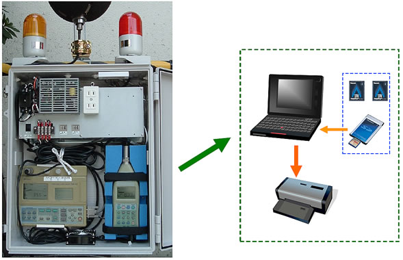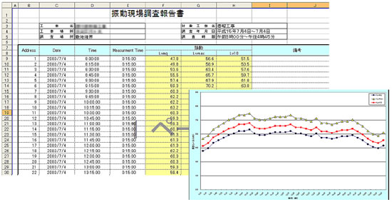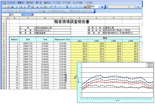 ■報告書作成手順 騒音計・振動計より記録媒体の専用CFカードを取出しカードホルダーに挿入後、パソコンに保存し専用ソフトを動作して作成できます。必要がある場合はプリンターで出力してください。(専用ソフト1枚で騒音・振動両方対応しております。) ![]() ■データ出力の表とグラフ ●騒音データ ![]() ●振動データ ![]() ■オプション