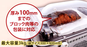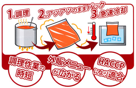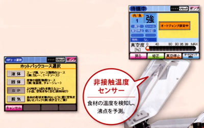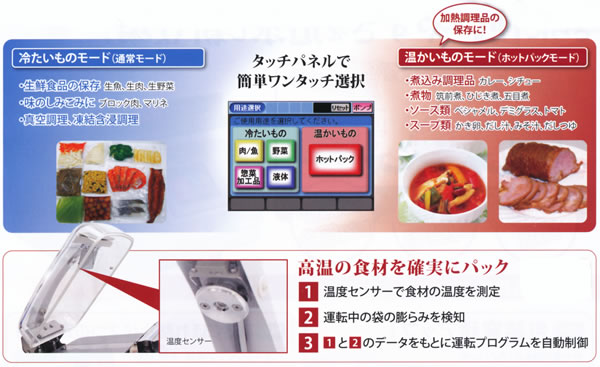 ■概要![]() ■特長 ●包装容積アップ! かたまり肉もらくらくパック。 ![]() ●吹きこぼれ防止に2つの新機能! ・「オートジャンプ機能」を使えば沸騰を感知して減圧を停止。 ・液体のホットパックは「SPコース」で吹きこぼれを抑え、しっかり真空。 ![]() ●介護食で注目の「凍結含浸調理プログラム」搭載! 凍結含浸調理とは食材の形はそのままで、歯茎や舌つぶせる介護食の新調理法。 ※凍結含浸調理に対応可能です。 ![]() ●「ポンプクリーニング機能」搭載! 機械の電源をOFFにすると自動でポンプクリーニングをスタート。 真空ポンプの性能を維持します。 ![]() ■食材の温度に合わせてモードを使い分け、作業効率改善。 加熱調理したアツアツの食材は「ホットパックモード」で、冷たい食材は「通常モード」でパック。 菌の繁殖温度帯を避けてパックすることで衛生的となり、作業の効率化にも貢献します。 ![]() ■仕様