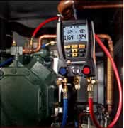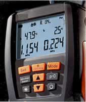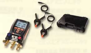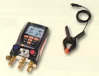 | ■特徴 ●圧力センサ2基を搭載しており、低圧側・高圧側それぞれの冷媒圧力を測定し、デジタル表示します。 ●内蔵の冷媒データ(圧力・温度特性)により、冷媒圧力の計測値から冷媒の蒸発温度・凝縮温度を表示します。 ●気密試験(リークテスト)にも対応します。温度補正つき。 ●冷暖自動切換モード(冷暖房モード)の場合、自動的に高圧側と低圧側の圧力・温度の表示を切り替えます。 ●温度プローブを接続すれば、過熱度・過冷却度を演算します。 ●プロテクションカバー付の頑丈なボディ設計。 ■各名称 ![]() ![]() ■凝縮と蒸発 低圧側・高圧側の冷媒圧力を迅速かつ正確に計測します。 33種類の内蔵冷媒データ(圧力・温度特性)により、冷媒圧力の計測値から冷媒の蒸発温度・凝縮温度を表示しま す。 ![]() ■過熱と過冷却 本体左右のコネクタに温度プローブを接続でき、冷媒の圧力計測と同時に冷媒の過熱度や過冷却度を演算し、ディス プレイに表示します。 ![]() ■パイプクランプ表面温度プローブ(型番:0613 5505) ![]() ■気密試験(リークテスト)にtesto 550は冷却システムの気密試験にも対応します。 試験中に温度が変化しても温度補正機能により正しく圧力が計測されます。 ●真空引き Vac画面で真空引きの状態を確認できます。 ![]() ■自動切換モード(冷暖房モード) 冷暖房システムの場合、自動的に高圧側と低圧側を切り換えますのでホースを交換する必要がありません。 ![]() ■仕様