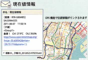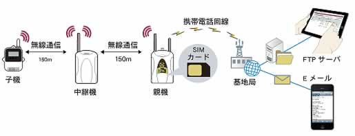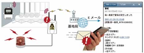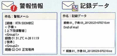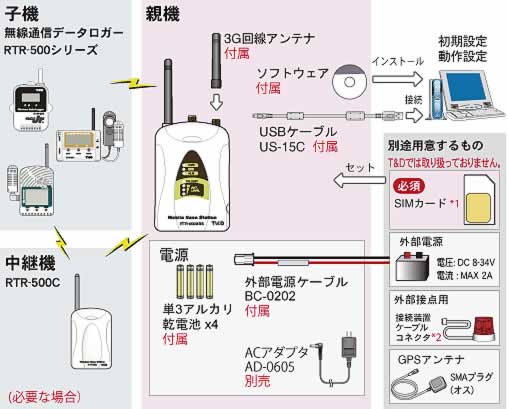 | ■概要 MD3TR-500MBSTは無線通信機能、3Gデータ通信(FOMA)機能を搭載した親機です。 無線で子機(ワイヤレスデータロガーRTR-500シリーズ)から測定データを収集し、自動送信(FTP / Eメール)します。 無償のクラウドサービス"おんどとり Web Storage"に対応しておりますので、データの送信先を別途ご用意いただく必要はありま せん。 インターネット経由でのモニタリング、データ収集を手軽に実現できます。 *NTTドコモFOMA網に対応した標準サイズのSIMカードをご利用頂けます。 SIMカードは製品には付属しておりませんので、別途ご契約いただく必要があります。 b-mobile等、仮想移動体通信事業者(MVNO)が提供する格安の通信プランを選択していただくこともできます。 *AC100Vで使用される場合は、別売のACアダプタ(AD-0605)をご用意ください。 ■使用事例 パソコン、ネットワーク環境のない場所の温度監視に 輸送貨物の温度監視と位置情報の確認 遠隔地にある工場・倉庫の測定データのモニタリング・自動監視 ![]() ■クラウドで遠隔管理 「おんどとり Web Storage」にデータ送信すればどこからでも閲覧でき、複数の利用者とデータ共有も ![]() ■警報監視機能 子機に上限値/下限値/判定時間を設定、異常時にはメール通報 ![]() ![]() ■GPSによる位置情報のモニタリング 車両などの位置情報と荷室の温度を同時にモニタリング ![]() ■無線通信機能と3Gデータ通信機能を備えた親機 MD3TR-500MBSTが子機から記録データを無線通信で吸い上げ、携帯電話回線経由で記録データをEメール/FTP送信します。 *MD3TR-500MBSTは無線通信対応のデータロガーRTR-500シリーズの子機全機種に対応しています。 *SIMカードは別途ご用意していただく必要があります。 ![]() ■広いエリアで利用できるNTTドコモFOMA網対応 NTTドコモFOMA / Xi に対応した標準サイズのSIMカードに対応しています。 FOMAがつながる場所ならどこでも使用できるので、データ収集・監視のエリアが広がります。 ・ケーブル配線ができないエリア ・パソコン・ネットワーク環境がないエリア ・移動中の輸送車 月々のランニングコストは携帯通信料のみです。最も安いプランなら月額493円でシステム構築が可能です。 (2013年1月当社調べ) ![]() ■おんどとりWeb Storageに対応 データの送信先をT&Dの無償のクラウドサービス "おんどとり Web Storage" に設定すると、インターネット経由でデータを確認で きます。 遠隔地からの現在値モニタリングやデータ共有が可能になります。 ![]() ■警報監視機能 子機ごとに上限値、下限値、警報判定時間を設定でき、指定したメールアドレス(4件まで指定可能)に警報メールを送信できます。 警報内容 ・測定値が設定した上下限値の範囲を超えた場合 ・センサエラー(接触不良等)が起きた場合 ・子機の電池残量が少なくなった場合 ・無線通信が一定時間連続して失敗した場合 ・上記の警報状態が解除された場合 ・外部接点入力からの信号がONの状態になった場合 ![]() 警報動作 *判定時間は設定された上下限値を超えた状態が持続した時間です。10秒から60分まで12通りの設定が可能です。 警報LEDの点灯 MD3TR-500MBSTの警報LEDが点灯します。 警報メールを送信 設定されたEメールアドレスに、警報メールを送信します。 外部接点出力 警報LEDと連動し、MD3TR-500MBSTの外部出力もONの状態になります。 出力端子にサイレンやブザーなど、警報表示端末を接続すれば、より確実に警報発生を把握できます。 外部接点入力 遮断器、開閉器、電磁接触器など設備監視システムをMD3TR-500MBSTの入力端子に接続し、外部からの電力信号(ON/OFF) を検知できるようにします。信号がONの状態になると警報メールを送信します。 ■選べる供給電源 MD3TR-500MBSTは単3アルカリ乾電池4本で約2日間動作可能です。 長期間連続使用するには別途外部電源をご用意ください。 指定のACアダプタか外部電源(DC 8〜34 V )の使用が可能です。 ![]() ■1台につき子機20台まで一括管理可能 1台のMD3TR-500MBSTに最大20台の子機を登録して一括管理ができます。 ■製品構成 *1:MD3TR-500MBSTで利用可能なSIMカードについてを確認してください。 *2:適合コネクタは PAP-04V-S ( J.S.T. 社製)です。 ![]() ■仕様