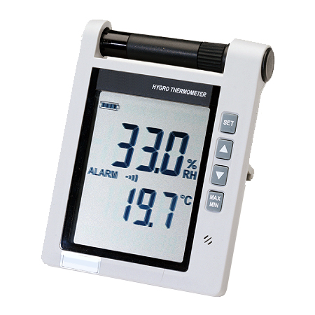 | ●大画面LCDディスプレイ。 ●アラーム設定をすることで温度や湿度を一定に保たなければならない環境管理が可能。 ●最大値・最小値表示機能付。 ![]() ■仕様