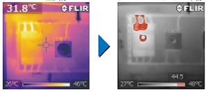 | ■特長 ●簡単操作、フォーカスフリー 電源を入れ、対象に向ければ測定を始めます。トリガーを引けば撮影(データの保存)完了。焦点を合わせる必要は一切ありません。(測定距離:40cm以上) ![]() ●コンパクトサイズ:223×79×85mm、365g ●片手でホールド、親指1本で操作。長年のノウハウが蓄積された人間工学に基づくデザインは操作性が抜群です。 ●2.8インチ液晶モニター ●ソフトウェア標準装備 ●SDカードにデータ保存 ![]() ●アイソサーム機能(MD7HI-T502B3Cに搭載) 設定温度値を高温側で超えた部分を赤、低温側で超えた部分を青で表示します。 ・電気設備の異常発熱チェック ・生産ライン、装置のメンテナンス ・冷凍庫/冷蔵庫内の温度管理 ![]() ■用途 ●配電盤、分電盤、電気接続の異常チェック ●モーター、コンプレッサーなど装置の異常発熱チェック ●空調ダクト、配管、水漏れ、冠水など住環境チェック ●食品などの流通、保管の室内温度分布チェック ●冷房、床暖房のエネルギーロス検出など ●生産ライン上の移動対象物の表面温度チェック ●加熱ムラの防止、焼付塗装時の温度チェック ●各種研究開発、品質管理に ■ラインナップ