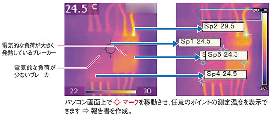 ■解像度・・・感温素子(ピクセル)数 ●感温素子(ピクセル)の大きさは3機種とも同じです。 ●感温素子(ピクセル)数がそれぞれ異なり、3機種の解像度の相違となります。 ![]() ■データの保存と活用 ●標準JPGE画像をminiSDカードに保存・・・温度情報が含まれる熱画像は、専用ソフトウェアで解析できます。また、一般の画像としても使用できます。 ●USBでパソコンへ測定データを送信 ●解析ソフトで測定結果の詳細を検証、報告書の政策が簡単に行えます。 ■解析ソフトウェア 標準装備の解析ソフトで、測定データの整理・解析〜レポート作成が簡単操作で行えます。 <機能> ・レベル/スパン、カラーパレットの調整 ・スポットメータ、ライン、エリアの作成 ・1枚以上の画像を電子メールで送信 ・検査レポートへの自社ロゴの追加 ・画像のドラッグ&ドロップでレポートページをプレビュー ・文字コメントの追加/削除/編集 <活用> ・電気設備・動力装置の安全管理 ・保守・保全・メンテナンスなどの検査・調査履歴のデータ作成 ・空調機器とその効果の寺家入れるレポート作成 ・家畜、飼育動物などの体温管理データ作成 ・過負荷、絶縁不良、ボルトの緩み、機器の不良などが活線時に判定できます。 ![]() ■仕様