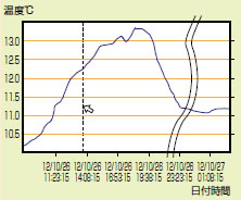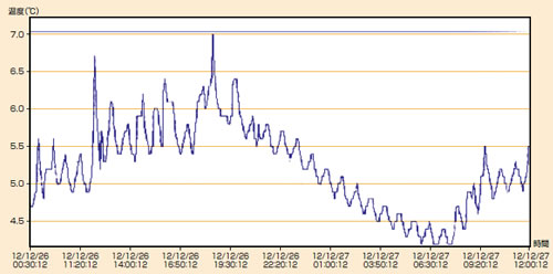 ![]() ●例2・帳表 ユーザーインフォメーション : 例えば…タスコジャパン(株)本社コンピュータ室 インターバル間隔/データ数 Max、温度/Min、温度/平均値 スタート時間/終了時間等の表記 ![]() ●例3・グラフ ![]()