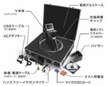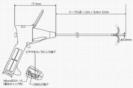 | ■全方向360°簡単アングル操作 先端部の湾曲操作には、応答性と操作性に優れたダイレクトコントロール方式の新機構ジョイスティックを採用。 複雑に入り組んだ現場での湾曲操作も意のままに操れます。 ジョイスティックから指を離すだけで、湾曲形状を正確に保持。検査実務を重視した利便性を備えています。 ![]() ![]() ■メタルブレードで挿入性・耐久性が向上 外形6.9mmの挿入部(カメラケーブル)にメタルブレードを採用することで、挿入性と耐久性を大幅に向上。 細管の湾曲形状への挿入も手元押込みがスムーズになり、最小クラスの先端硬質長(15mm)が先端の曲がり、通 過性を強力にアシスタントします。 ![]() ![]() ■2倍デジタルズーム表示 ズーム表示切替ボタン1つで、モニター上でのズーム表示が可能です。 ※被写体を広く見渡し、気になる箇所を大きく映して詳細画像で確認ができます。 ※外部モニターでの表示切替は対応していません。 ![]() ■温度警告センサー カメラケーブル先端に温度センサーを装備。観察地点でのケーブル先端の温度を計測してモニター表示します。 また、ケーブル先端が限界温度に近づくと警告マークを表示します。 ![]() ■音声記録 付属のハンズフリーマイクロフォンで、動画と共に音声も保存。観察時の情報を音声記録することができます。 ![]() ■超高輝度LED4灯搭載 φ6.9mmの先端部には超高輝度白色LED4灯を内蔵。 OFF~HIGHまで5段階の光量調節が可能で、被写体や撮影状況に合わせ最適な明るさを設定して観察できます。 ![]() ■LEDフラッシュ撮影 太径の配管内や暗い空間での被写体撮影時に、4灯のLEDによるフラッシュ撮影機能が威力を発揮。 デジタルカメラのフラッシュ撮影感覚で被写体を鮮明に撮影できます。 ![]() ![]() ■携帯性に優れたコンパクトボディ 多彩な機能を搭載し、携帯性に優れた「片手で持てるコンパクトボディ」を実現。 モニターは大きく見やすい3.5インチカラーデジタルTFTを採用。 記録メディアは汎用性の高いマイクロSDカードでの記録が可能です。 また、専用スタンドを標準装備。 器具への固定やハンズフリーでの使用にも役立ちます。 ![]() ■どこでも手軽に使える乾電池仕様 単三アルカリ乾電池4本で連続1.5時間の使用が可能。 また、市販の単三充電池を使用することでランニングコストを抑えることもでき、経済的です。 電源のある現場では付属のACアダプタの使用も可能です。 ![]() ■構造図 ![]() ![]() ![]() ![]() ■セット内容 ![]() ■主要装備・機能