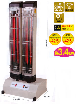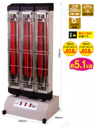 ■遠赤外線の優れた特徴 遠赤外線はおよそ4〜1000μm(マイクロメーター)の電磁波のことをいい、直進性が強く、 熱が物質に吸収されやすい特徴をもっています。 しかも人間の体はその90〜95%が吸収されるので、身体の中から効率よく温まります。 さらに風の影響を受けないため、解放された空間でも有効に活用できます。 ![]() ■製品特長 ●熱源はシーズヒーター 衝撃に強く、長寿命・高効率! 作業現場などの厳しい環境にも最適です。 ![]() ●転倒時も安心!電源遮断装置付 転倒時電源遮断装置付。 作業中でも本体が倒れると自動的に電源が切れる安心機能! しかも燃焼式ではないので不完全燃焼の心配もありません。 ●移動・収納に便利なキャスター付 移動時や収納時に便利なキャスター付! 女性でもヒーターをラクラク引くことができます。 ![]() ●ワイドな温かさを実現! 連結されたヒーターは個別に動かすことができます。 人数や空間の形などに合わせてヒーターの向きを調整すれば、 お客様お望みの範囲で体を温めることができます。 ※ME1FH-20TPN、ME1FH-30TPN ![]() ●ヒーターは個別にON・OFFが可能! 個別可変なのでシーンに合わせた仕様が可能です。 ※ME1FH-20TPN、ME1FH-30TPN