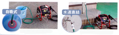 ■水道からでも、貯水タンク等からでも給水できる2種類の専用給水ホース付き