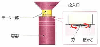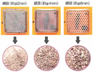 | ■粉砕方法 ●スイッチをONにしてから材料を投入口に投入します。 ●1回当たり最大粉砕量は約7kgです。最大粉砕量以上の投入は詰まりや故障の原因となりますのでおやめ下さい。 ●粉砕時、容器にビニール袋等をかけて粉砕物が入るようにすると、お手入れが簡単です。(推奨) ■刃のメンテナンスが簡単にできます。 ナットを1つ取り外すだけで刃の取り外しが容易、洗浄、切替刃の交換が簡単にできます。 ![]() ■飼料粉砕例 ![]() ![]() ■網目3種類の網かごが標準付属 粉砕の細かさを調整できます。 ![]() ■寸法図 ![]() ■各部名称 ![]() ■仕様