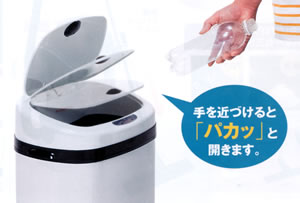 手を近づけると蓋が自動的に開く! 自動開閉センサー付ゴミ箱です。 中身が見えずニオイも抑えるから日々の生活にピッタリ! |