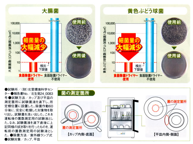 | ■特長 ●食器類を効率良く収納できる4種類の専用網棚 ●丈夫で水アカが付きにくいステンレス製 ●扉を開けると自動的に消灯する安全設計 ●内側のステンレス面が紫外線を反射して効率アップ ●簡単・ラクラク操作部 ![]() ![]() ■『除菌効果検証実験』大腸菌や黄色ぶどう球菌の数を調べてみた結果… ![]() ■寸法 ![]() ■仕様
