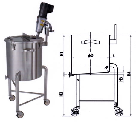 ●キャスターカクハン機取付テーパー底タンク ![]() 材質・・・SUS304 キャスター・・・SUS+ウレタン車(内ストッパー付2個) パッキン・・・シリコンゴム(食品衛生法適合品) ドレン高(H2)・・・400mm ・表面処理:内外面バフ研磨 ・使用条件:大気圧(加減圧不可)