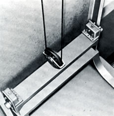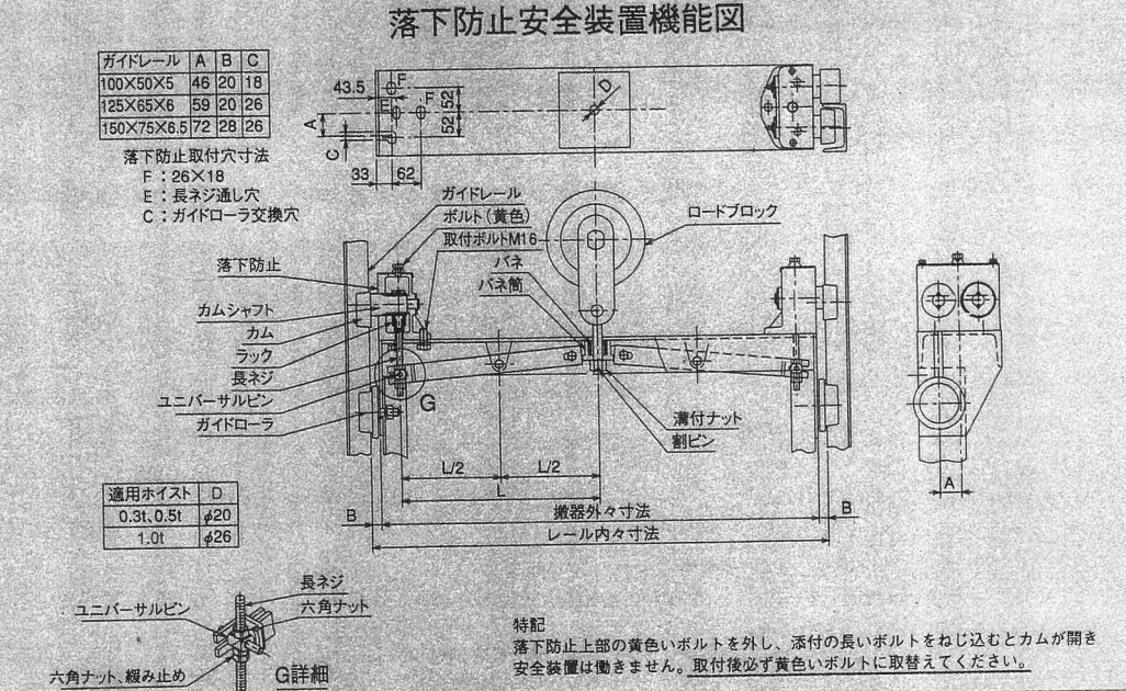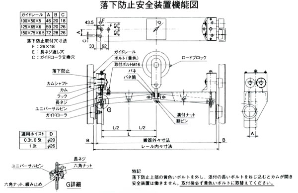 簡易リフト部品落下防止安全装置/ME24F-005N 簡易リフトの万一の故障(ワイヤロープ切断・巻上機の故障・ガイドレールの故障・降下中の障害物)の場合、ワイヤロープの荷重の変化により自動的に偏心歯止めカムローラーが働き瞬時にガイドレールに食い込み停止して、リフトを確実に保護して事故を未然に防止します。