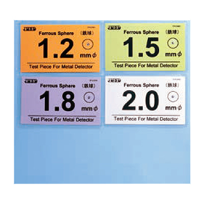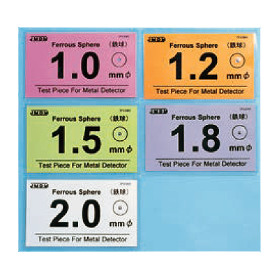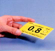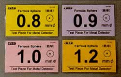 2.検針機用テストピースの感度について テストピースは製造方式の違いで、同じ表示サイズでも検針機を通過させた時、表示サイズどおりの信号が出るものと出ないものがあります。 折れ針の発見を目的とする検針機の構造上、服飾品などの特殊処理をした金属を検出しないように設計されています。 アクリル系の樹脂に多く見られる現象ですが、樹脂製のベースに鉄球や針先を埋め込んだテストピースでは、その樹脂の性質で検知信号を弱めるものがあります。 弱まる量はセンサーゲートの通過位置や角度で異なり一定ではありません。 ラミネートのカード式テストピース(意匠登録第1241371号)の樹脂材料は磁界への影響がないので、常に正確な反応をします。 また厚みが非堂に薄いので製品に挟んだり、製品の上に乗せてセンサーゲートを通過させるとベルト面からの位置を正確に出すことが容易です。