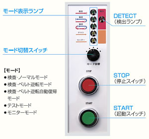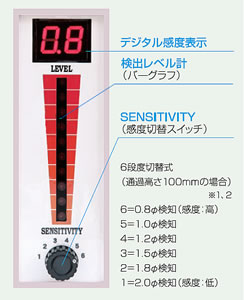 | ■特徴 <アンプ部> (1)金属ボタンやファスナーなど、服飾品(NC対応品)のついた縫製品の折針や残針を目的として作られた高感度のコンベヤー式検針機です。 (2)最小φ0.8の鉄球を感知できます。※1 最高感知度はゲート内のどの位置でも0.8φの鉄球を検知できます。 (3)大型のデジタル感度表示により、管理者や荷主様の立会時に離れたところからでも検針感度が正確にわかります。 従来の「ME30R-M08N」の設定感度は感度切替スイッチの1~6の数字のみで表示していましたが、【ME30R-M08N-2】では感度切替スイッチの数字に対応する鉄球換算の感度をデジタル数値で表示しています。 感度切替スイッチを「6」に合わせると0.8φ鉄球を感知しますので、デジタル感度表示は「0.8」になります。 (4)検知感度は6段階の切替式です。 検知感度は検査品のファスナーや金属ボタンなどの服飾品で検知動作をしない感度に設定します。検知することができる折れ針の大きさを鉄球に換算して6段階をSENSITIVITY(感度切替スイッチ)で選ぶことができます。 感度切替スイッチの数字と検知する鉄球の大きさは左画像を確認してください。※2 「5」に合わせると1.0φを含めたそれより大きい物を検知し、0.8φは検知しません。 感度設定がボリュームのように連続可変式では、設定する個人により差が出たり、右回しで合わせた時と左回しで合わせた時で差が出ることがあります。【ME30R-M08N-2】は1から6の切替スイッチ方式で、微調整も個人差もなく常に安定した高品質の検針ができます。 アルミ蒸着の袋の中身の検査も可能です。 ![]() <コンベヤーコントロール部> (5)全ての動作モードは、1つのツマミの切替式で簡単操作です。 従来の「ME30R-M08N」ではSTART/STOPの「押ボタンスイッチ」、「逆転スイッチ」、「TESTスイッチ」の操作で、針検知後のベルト動作、モニターモード、テストモードを設定していました。 ME30R-M08N-2では1つのツマミで動作モードの切り替えができるようになりました。また選択したモードはランプ表示でわかりやすくなりました。 (6)針検知後のベルト動作を設定できます。 モード切替の操作で針検知後のベルト動作を設定することができます。 ①検査・ノーマルモード 検知動作後にベルトが停止し、STARTを押すとベルトが動きます。 ②検査・ベルト逆転モード 検知動作後にベルトが逆転し、製品が手元まで戻り、ベルトが停止します。STARTを押すとベルトが動きます。 ③検査・ベルト逆転自動復帰モード 検知動作後にベルトが逆転し、製品が手元まで戻り、ベルトが停止します。ベルトはおよそ3秒後に自動で再スタートします。 (7)その他の機能 ●テストモード 針を検知した時にブザーは鳴りやみますが、ベルトは停止しません。 ●モニターモード ベルトは停止した状態ですが、アンプ部はONになります。設置場所の電気・磁気ノイズなどの外部影響をバーグラフの振れで確認できます。 (8)ME30R-M08N-2は静音設計です。 事務所など静かであることが要求される場所でもお使いいただけます。発生する音はメーカー基準レベル以下であることを全数検査しています。 (9)優れた高感度と耐ノイズ性を実現しました。 検針機は強力な磁石を使い、金属が近づいた時の起こる「磁気の変化」を検知信号に変えています。その原理上ミシンや機会のモータなどから出る時期や電気ノイズに影響を受け検知動作をします。 特にソレノイド(電磁石)を使った糸切カッターや、インバータ方式の変速モータ(VSモーター)はかなり遠くまで検針機に影響のある磁気ノイズを発生します。 ME30R-M08N-2】は新設計のノイズキャンセラーにより、耐ノイズ性能が大幅に向上し、検知感度もアップしました。 ![]() ■上面ガイド仕様 ●検査品がセンサーゲートに当るとセンサーげーどが動き、磁界の乱れが発生するので検知動作をします。上面ガイドを取り付けると正常な検針ができます。 ●厚物などの検針が可能になります。 ●装着時の通過高さは10mm低くなりますが、検知能力は変わりません。 ●発注時の指定が必要で、完成後の取付はできません。 ![]() ■仕様