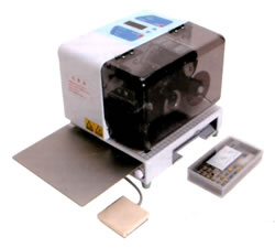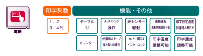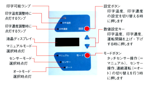 ■手軽な操作で印字 手軽な操作でボイル処理やひっかいにも強く、美しい印字ができます(※)。 設定を変えることにより1、2、3、4列プリンターとして使用できます。 ※:一部、印字がきれいにできないフィルム(OP、CPなど)があります。 ●選べる操作方法 1.タッチスイッチ操作=タッチスイッチを押した時に駆動します 2.連続運転=設定した時間の間隔で自動的に駆動します 3.センサー操作=袋を印字部にセットすると駆動します ●附属活字明細 ![]() ![]() 本体ベース部分に活字を収納できます ■電動タイプならではの機能を搭載 ●印字温度調節機能=110℃〜180℃の範囲で10段階調整可能 ●印字濃度調整機能=11段階で印字の濃さを調整可能 ●運転間隔設定機能=0.1〜5秒の範囲で0.1秒刻みで調整可能 ●カウンター=0000〜9999の範囲で印字数をカウント ●印字設定温度到達時ランプ表示=設定した印字温度となった時にランプでお知らせ ●カバー開口インターロック=メンテナンス時などカバーを開いている時はモーターが駆動しない安全機構 ■コントロールパネル ![]() ■仕様