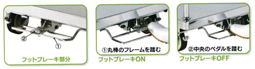 | ■特長 ●フット式ブレーキ ハンドル下のペダルを踏み込むことで簡単・確実に固定車二輪を同時にロックします。 ●オールステンレス製 フットブレーキも含め全ての部品がオールステンレス製台車です。(キャスター部を除く) ●両ハンドル 両ハンドルですから荷崩れに強く、ハンドルが押してや引き手になることでスムーズな搬送が可能です。 ![]() ■用途 ●製薬 ●理化学関連分野 ●食品製造 ●厨房 ■材質