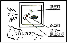| ■特長 ●外部出力(2点出力) 1点は換気扇もう1点は電磁弁の開閉などに接続できます。 またコンピュータなどのコントロールセンターに接続すればさまざまな対応が可能です。 ■使用方法 1.電源を入れてください。約3分間は警報機が作動状態に入る準備タイムです。(対象となるガスが存在しても警報を発しません)電源ランプ(緑)が点滅します。 ![]() 2.約3分後(作動状態)電源ランプ(緑)が点灯します。 ![]() 3.フロンを検知した場合 警報方式は即時警報方式を採用しています。フロンが警報設定濃度に達すると警報ランプ(赤)が点灯し、ブザーが鳴動します。また、外部出力信号が出ます。 ![]() 4.フロンガスがなくなると警報は自動的に止まり、2.の状態に戻ります。(自動復帰方式) ![]() ※ブザーが鳴動中、ブザースイッチを押すとブザーのみ停止します。(警報ランプ(赤)及び外部出力信号は動作したままです)ブザー停止スイッチを一度押すとガスがなくなるまで停止機能を維持し、再度ガスがくると鳴動します。 ■設置例 ![]() ■各部名称及び寸法 ![]() ■仕様