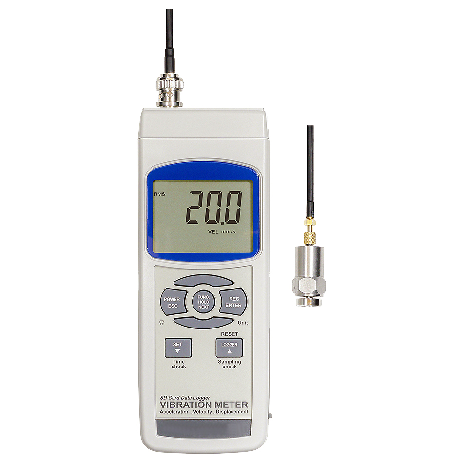 | 相対感度ISO2954適合品 振動の測定値を記録可能なデータロガー 測定範囲:速度 0.5~199.9m/s、加速度 0.5~199.9m/s2、変位 0.001~1.999mm ![]() ■特長 ●本体にセットしたSDカードに記録可能なデータロガー振動計 ●記録したデータはCSVファイルとしてExcel等のソフトに取り込み可能 ●液晶バックライト付き ●別売のソフトウェアやUSBケーブル/RS232Cケーブル使用でPCへのリアルタイムデータ転送が可能 ●振動する速さや振動エネルギーの大きさを表す「速度」の測定が可能 ●振動によって生じる衝撃力の大きさを表す「加速度」の測定が可能 ●測定物が振動により変化している幅(距離)をの大きさを表す「変位」の測定が可能 ●一定期間の振動最大値を表示するピーク値測定機能搭載 ●一定時間の振動平均値を表示する実効値(RMS)測定機能搭載 ●電池残量が少なくなると液晶上にイラスト表示でお知らせするローバッテリー機能搭載 ●測定値を固定するデータホールド機能搭載 ●測定値の最大値/最小値を表示するMAX/MIN値表示機能搭載 ●無操作時間約10分で電源がオフになるオートパワーオフ機能搭載 ●本体背面に卓上置きとして使用しやすいスタンド付き ■仕様